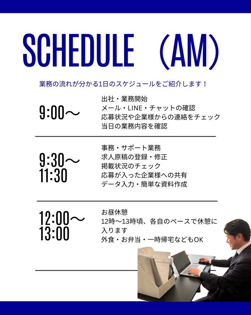 | 勤務時間 | 9:00~18:00(休憩60分) |