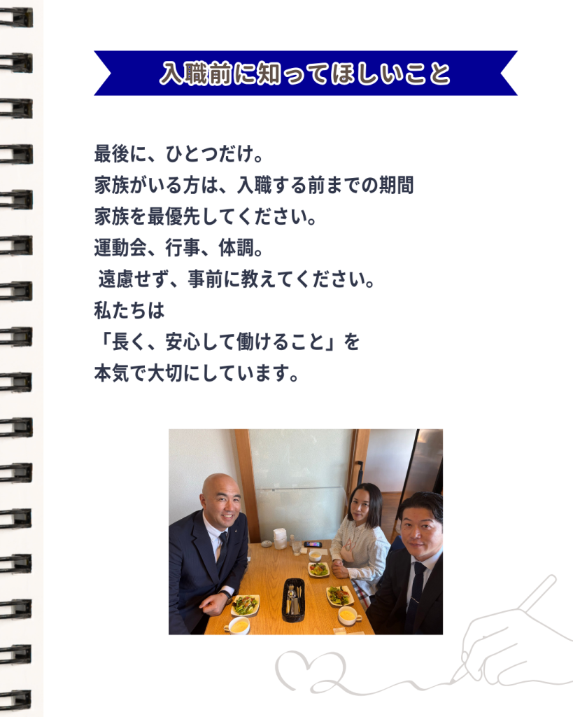 だからこそ、社員一人ひとりの声を大切にしながら、「働いてよかった」と思える環境をこれからも一緒につくっていきたいと考えています。